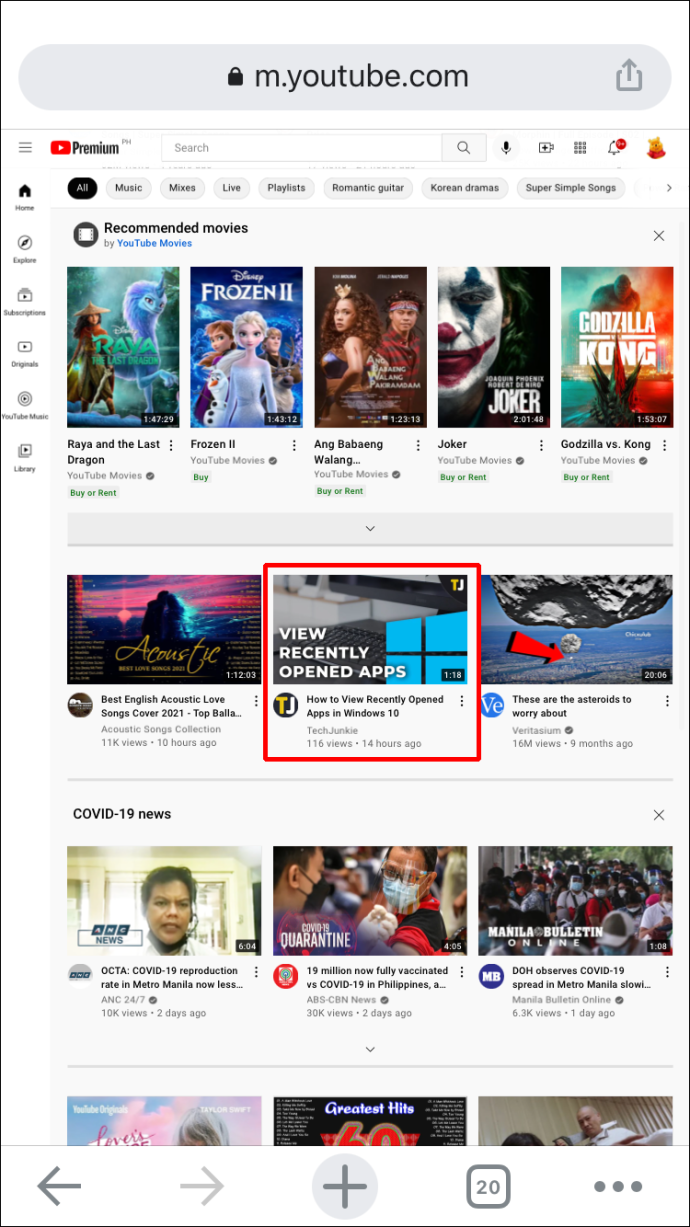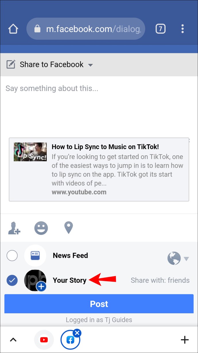 Otro método para añadir un enlace a una Historia de Facebook es utilizar YouTube. Antes de entrar en materia, aclaremos lo que tienes que hacer. En primer lugar, es importante que no utilices la aplicación de YouTube si la tienes. Este método sólo funcionará si inicias YouTube a través de un navegador. Si intentas utilizar la aplicación, sólo podrás compartir el enlace en la sección de noticias o en tus grupos.