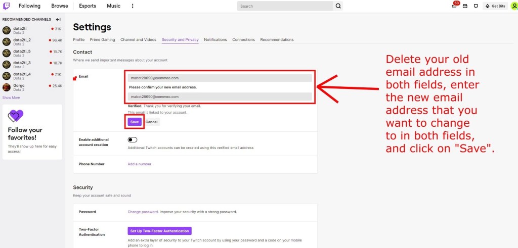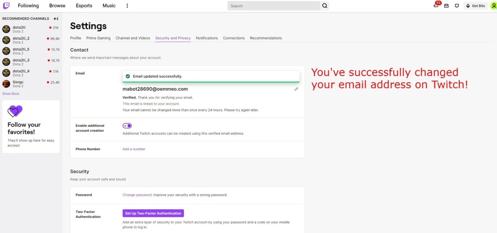 En tu configuración de seguridad y privacidad en Twitch, podrás cambiar tu número de teléfono y tu contraseña. Además, allí podrás cambiar tu dirección de correo electrónico.