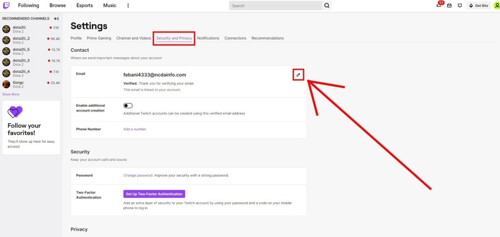 Para cambiar tu dirección de correo electrónico en Twitch, tienes que ir a tu configuración de seguridad y privacidad.