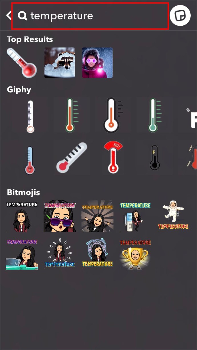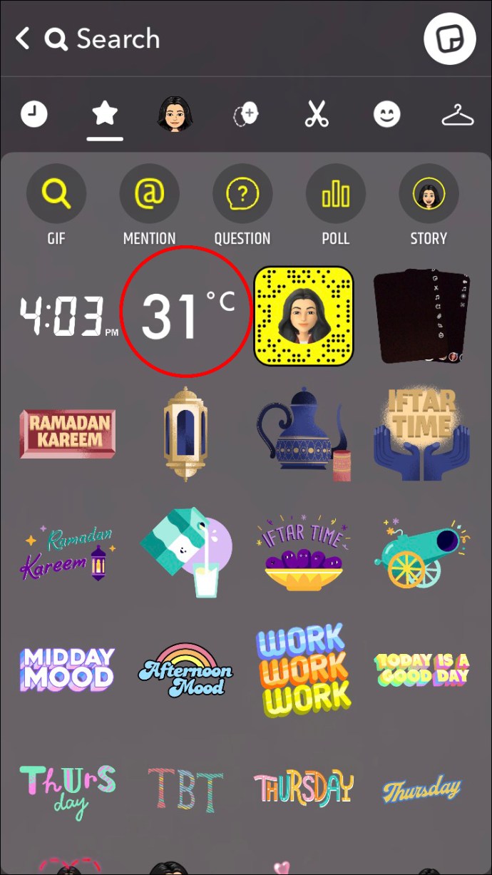 - Cuando encuentres el adhesivo de temperatura, haz clic en él para añadirlo a tu foto. El adhesivo mostrará la temperatura actual de tu ubicación.