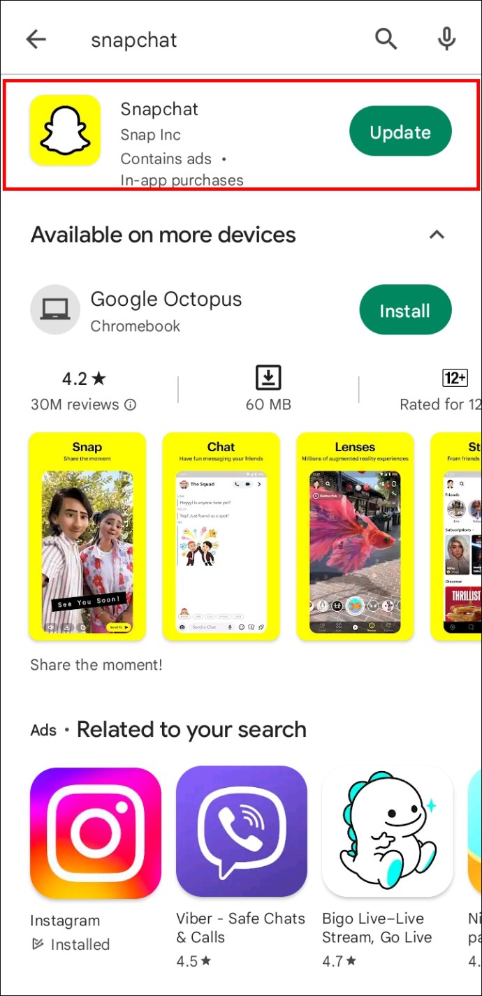 - Aparecerá un botón «Actualizar» junto a la aplicación, haz clic en él para actualizar la aplicación. Se descargará e instalará la última actualización de Snapchat.