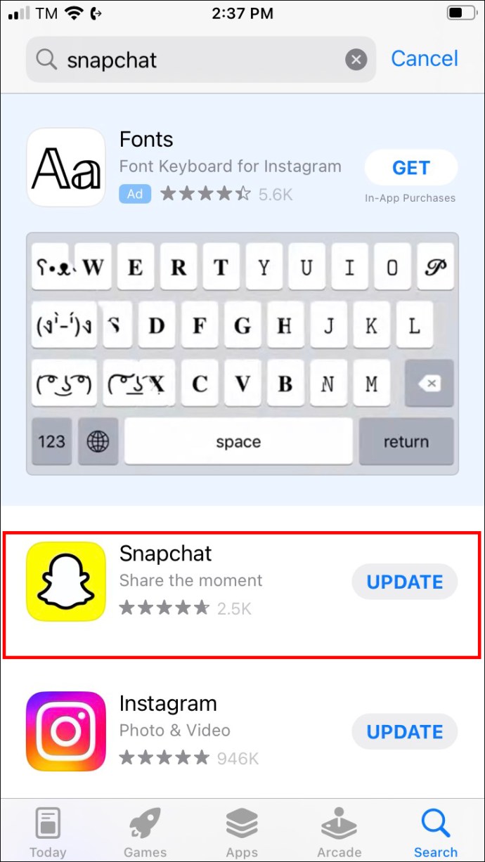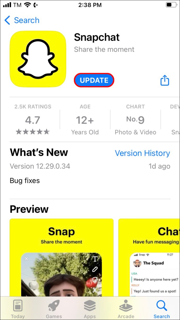- Si el botón «Actualizar» está visible, tócalo para actualizar la aplicación. Si no puedes ver el botón de actualización, significa que tu Snapchat ya está actualizado.