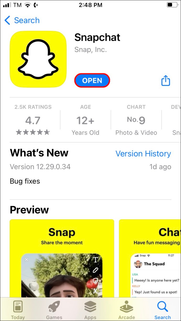 - Tu software Snapchat ya está actualizado si aparece el botón «Abrir» en lugar de la opción «Actualizar».