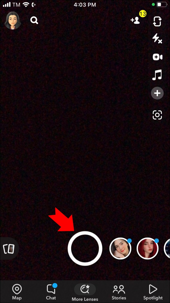 - Para hacer una foto, pulsa el botón circular blanco situado entre los iconos de recuerdos y filtro. Para grabar un vídeo, mantén pulsado el mismo botón.