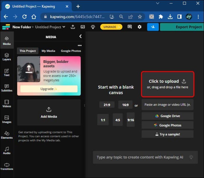 - Importa archivos desde tu ordenador, o utiliza la búsqueda de imágenes y fotos de archivo de Kapwing.