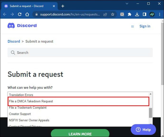 - Busca «Presentar una solicitud de retirada DMCA» en el menú desplegable.