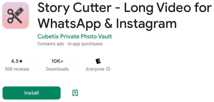 En Android, Cortador de historias de Cubetix Private Photo Vault es una excelente segunda opción, principalmente porque es fácil de usar y rápida. Mencionamos los nombres de los editores para protegerte de las aplicaciones de imitación y asegurarnos de que obtienes la correcta. Con Story Cutter, eliges el vídeo, seleccionas Instagram como fuente deseada, pulsas en Listoy deja que inicie el proceso de división. A partir de ahí, comparte cada clip/segmento en Instagram Stories, e IG los combina para hacer tu vídeo más largo.