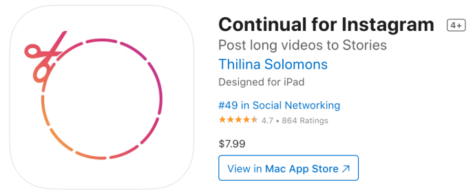 Si eres usuario de iPhone, considera desembolsar 7,99 $ por Continuo para Instagram. Esta aplicación recorta automáticamente tus vídeos más largos en incrementos de 15 segundos para compartirlos en tu Historia de Instagram. Luego puedes subir los clips juntos o individualmente.
